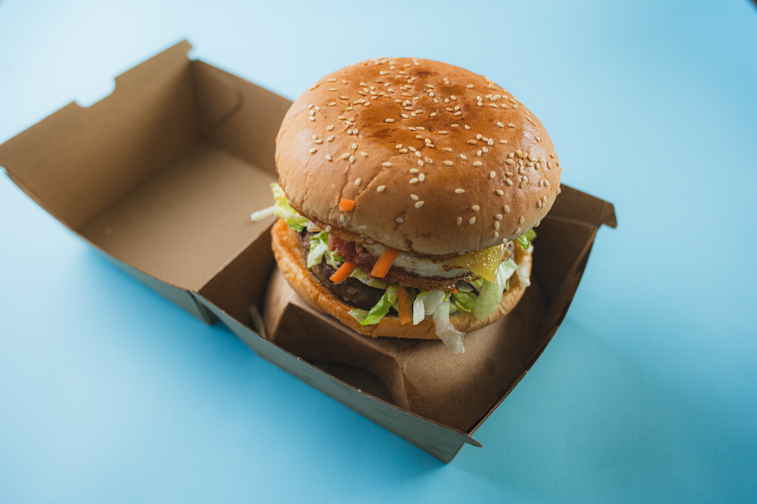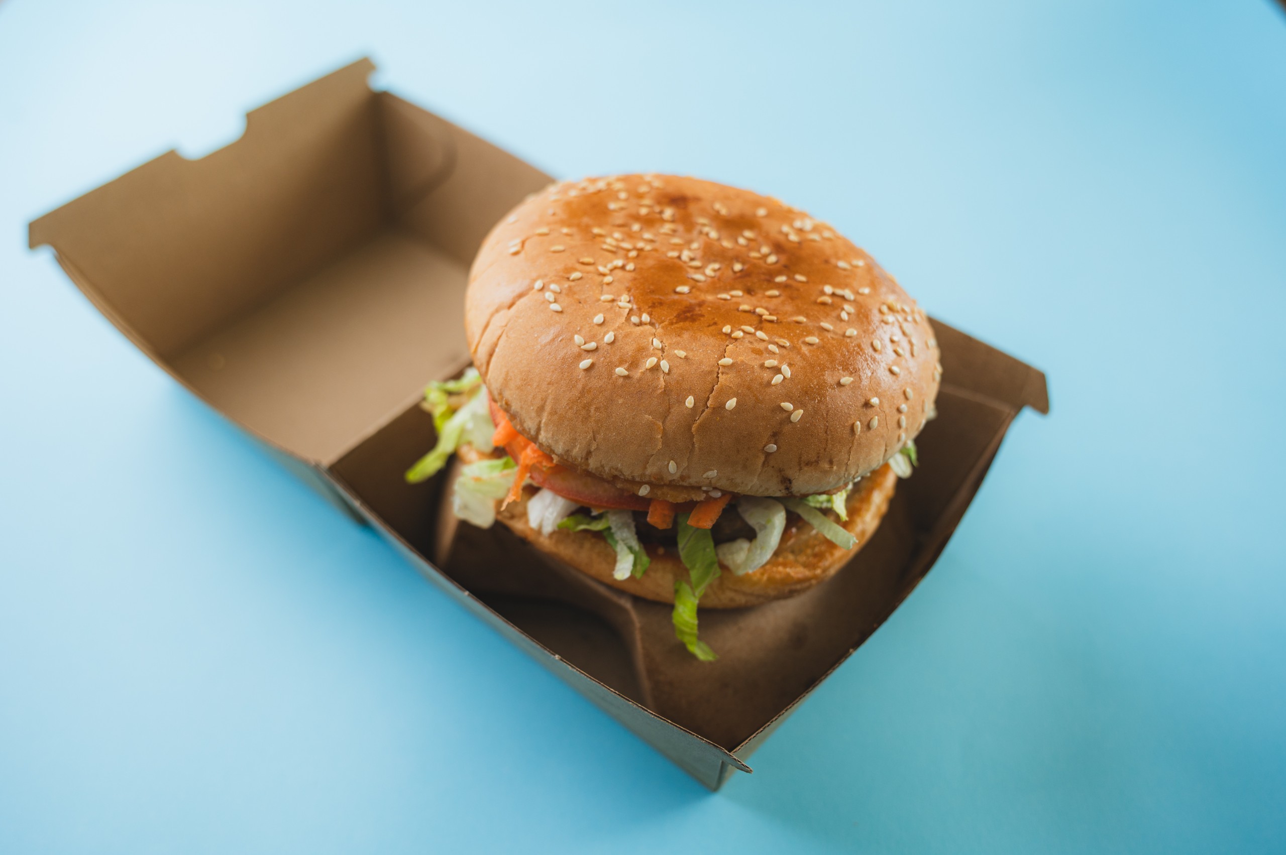Beef pattie, lettuce, tomato, onion, carrot and beetroot on a toasted hamburger bun with a choice of sauce
