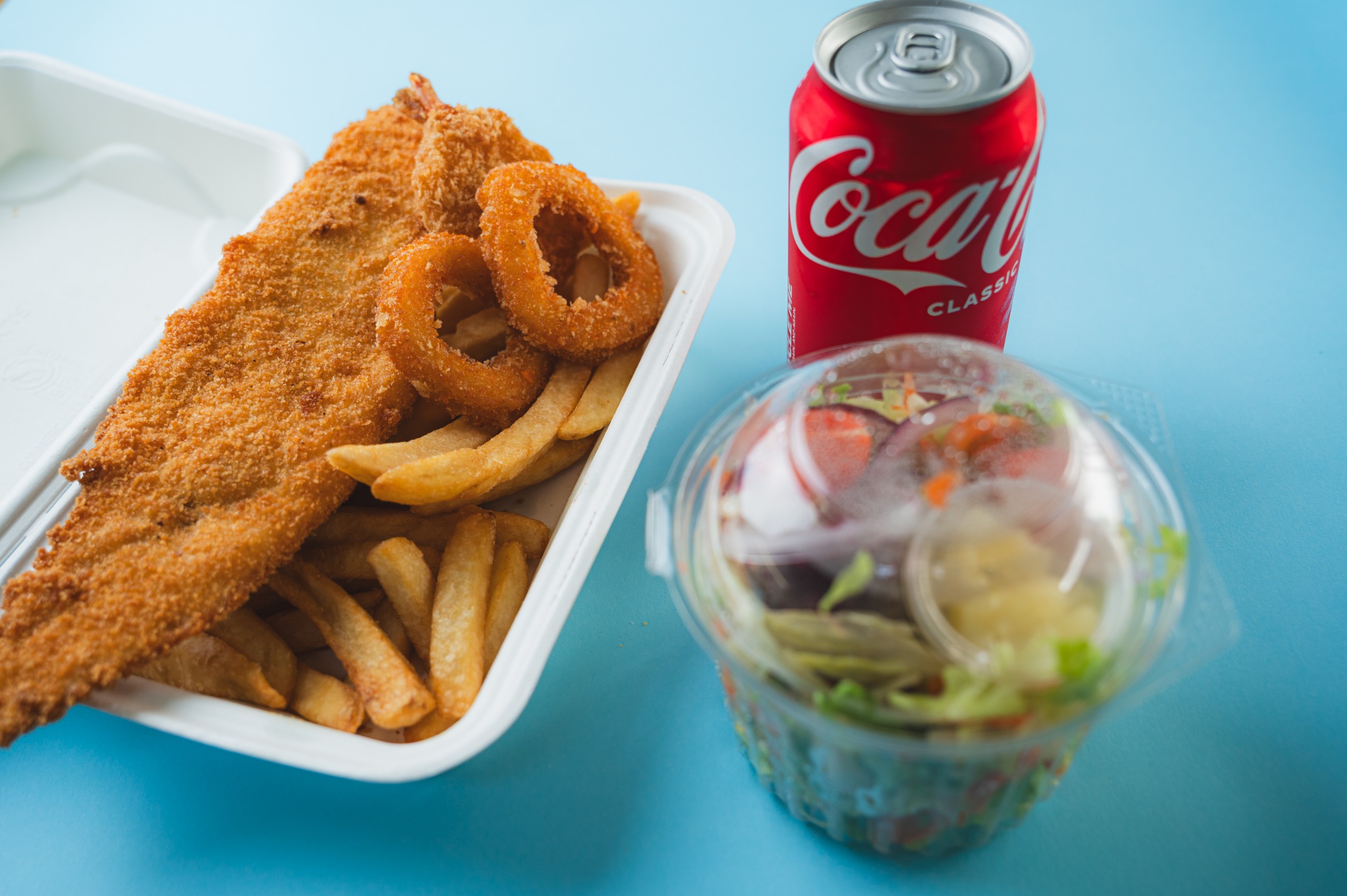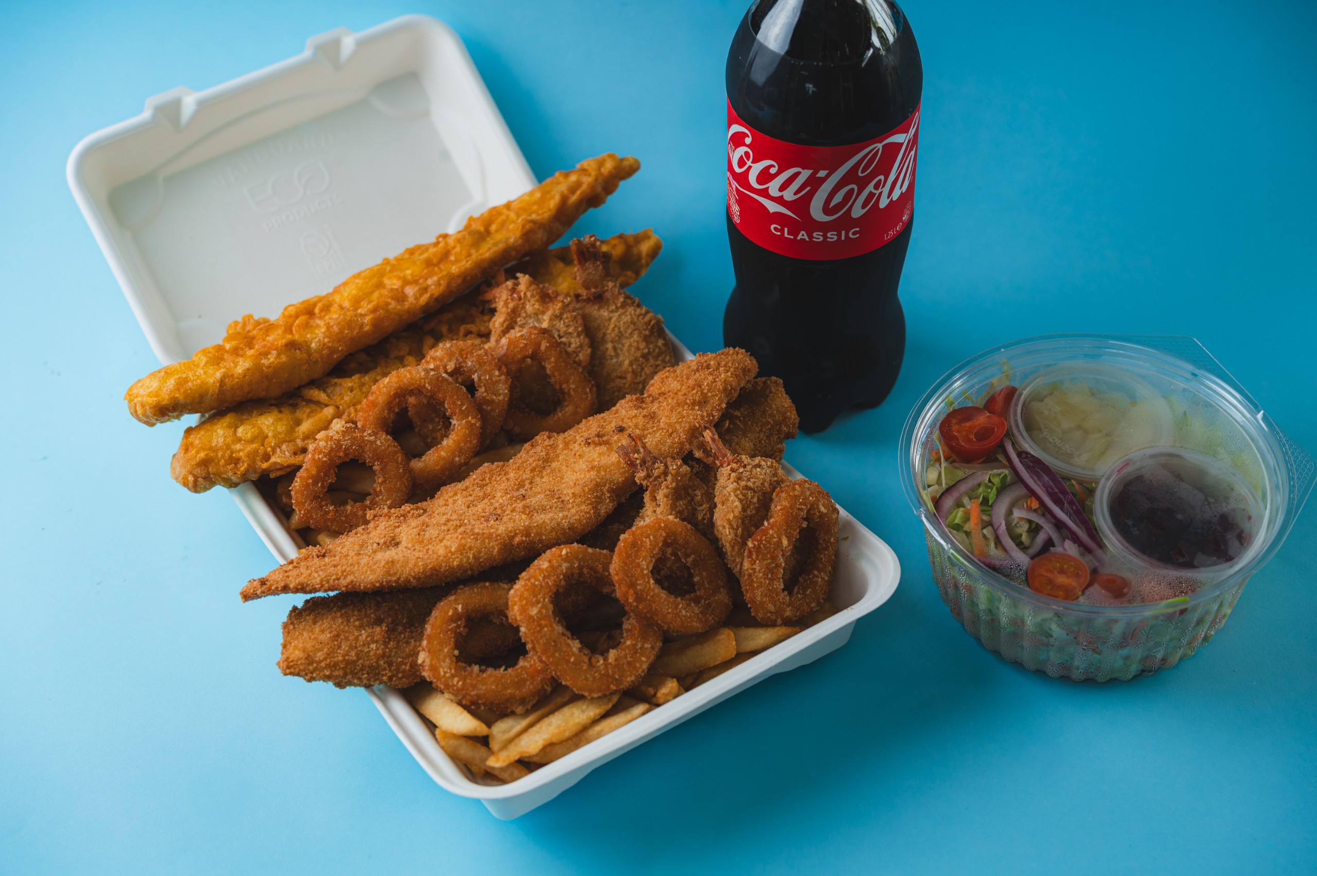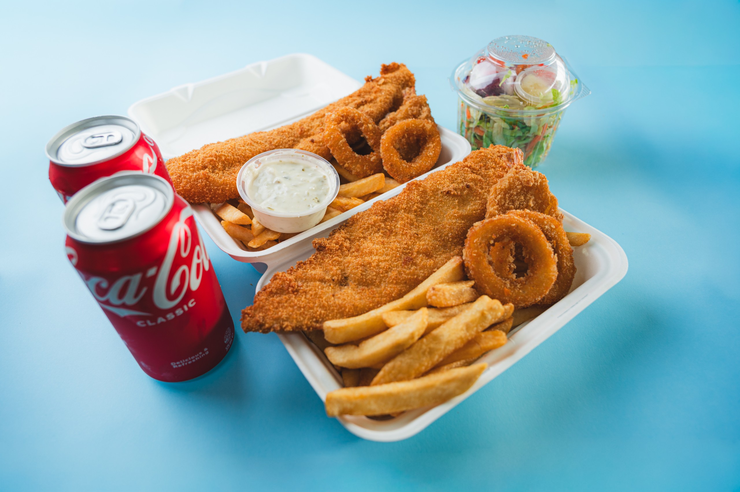 Two fish fillet, four calamari, tartare sauce, half scoop chips, two prawn cutlets, reg garden salad and 2 x 375ml cans of soft drinks