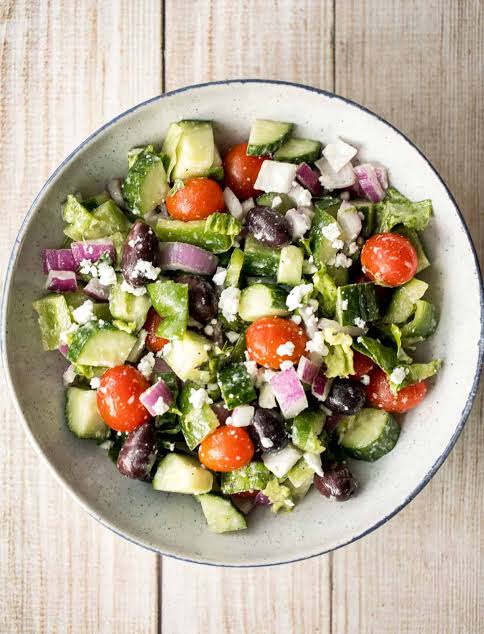 Greek Salad features a fresh blend of crisp lettuce, ripe tomatoes, cucumbers, Kalamata olives, and tangy feta cheese, all drizzled with a classic olive oil dressing. This healthy choice delivers authentic Mediterranean flavors in every bite.