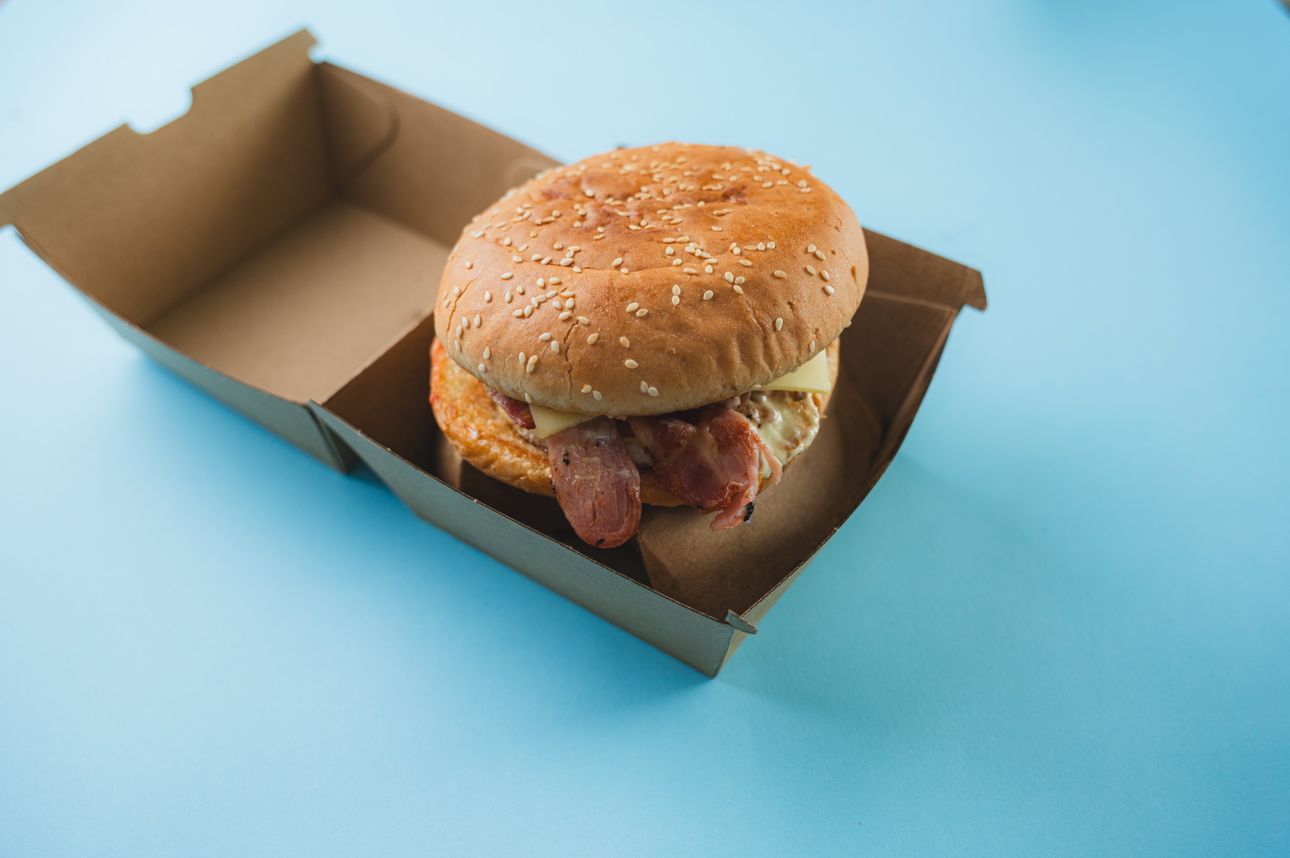 Crispy bacon, egg and cheese on a toasted hamburger bun