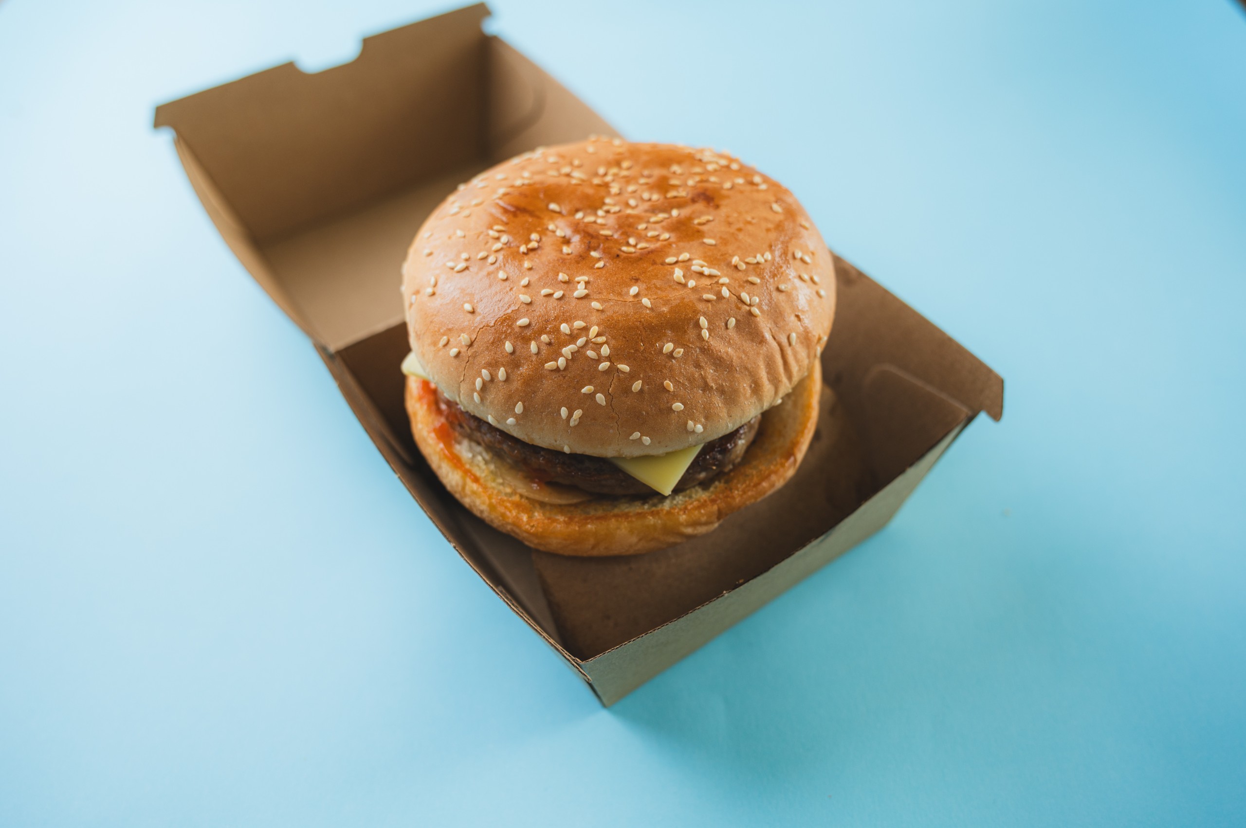 Beef pattie, cheese, onions on a toasted hamburger bun with a choice of sauce