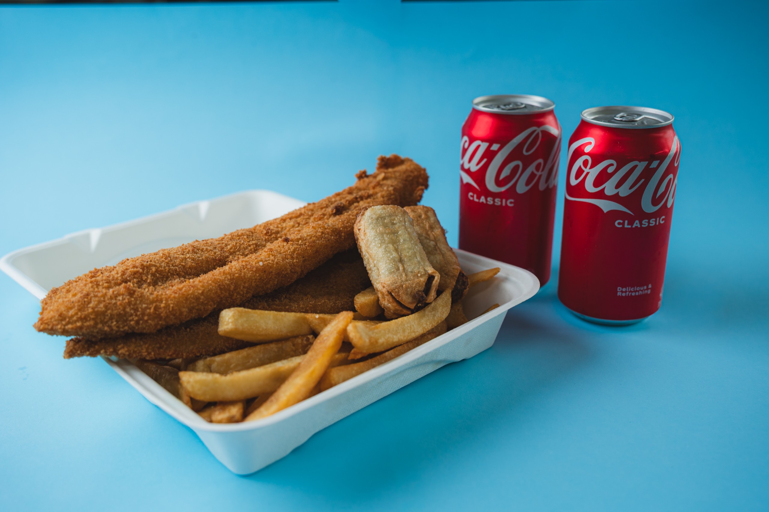 Two fish fillet, two dim sims, half scoop of chips and two 375ml cans drinks