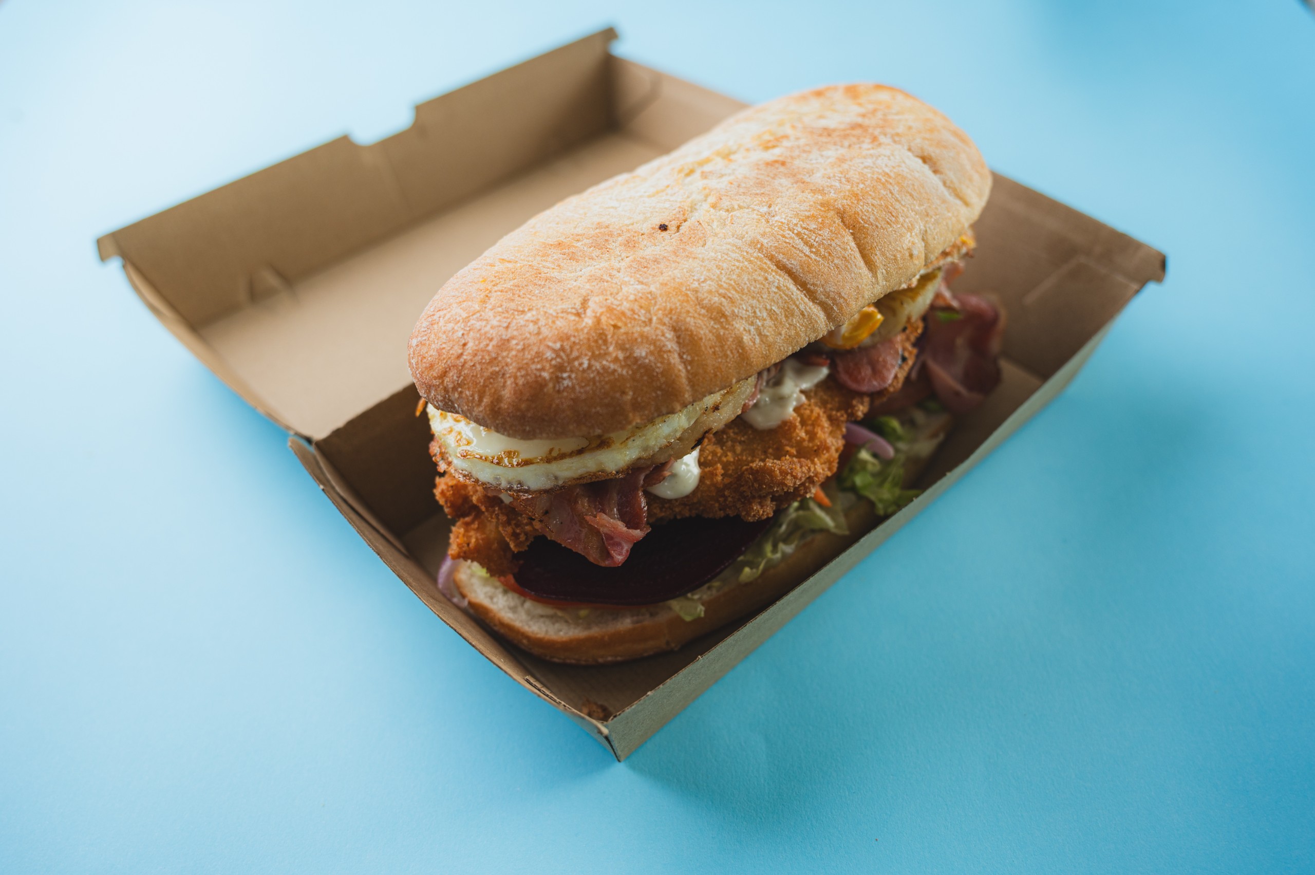 Chicken pattie, lettuce, tomato, onion, carrot and beetroot on a toasted Turkish roll with a choice of sauce
