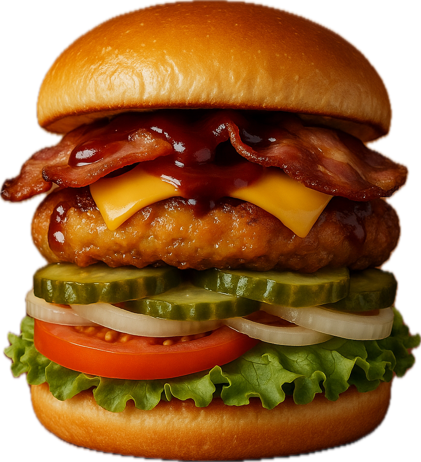 Battered Beef patty, Bacon, Cheese, grilled onions, lettuce, tomato, pickles, BBQ sauce on a toasted bun.